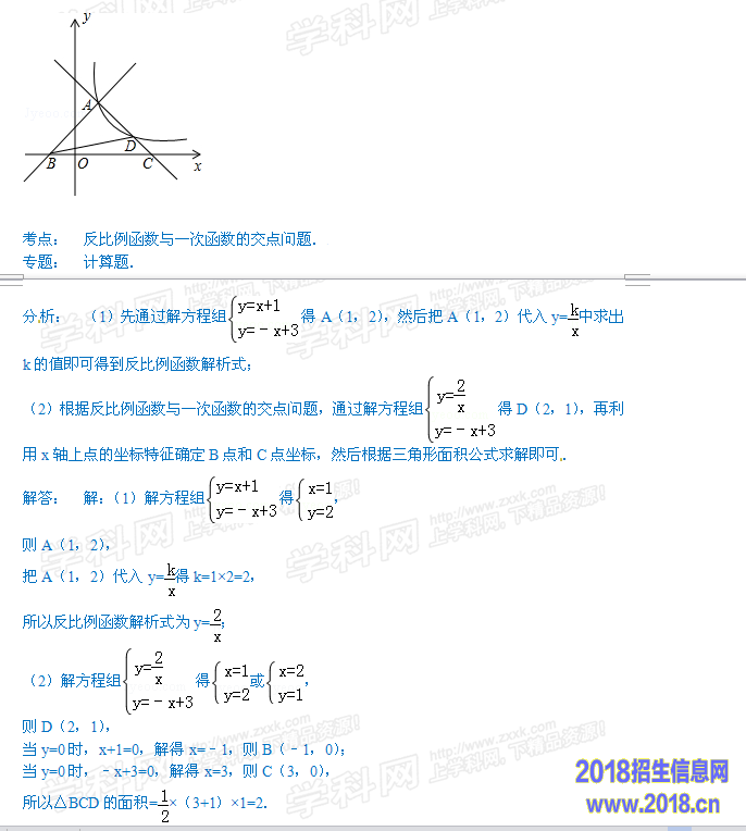 点评: 本题考查了反比例函数与一次函数的交点问题:求反比例函数与一次函数的交点坐标,把两个函数关系式联立成方程组求解,若方程组有解则两者有交点,方程组无解,则两者无交点.