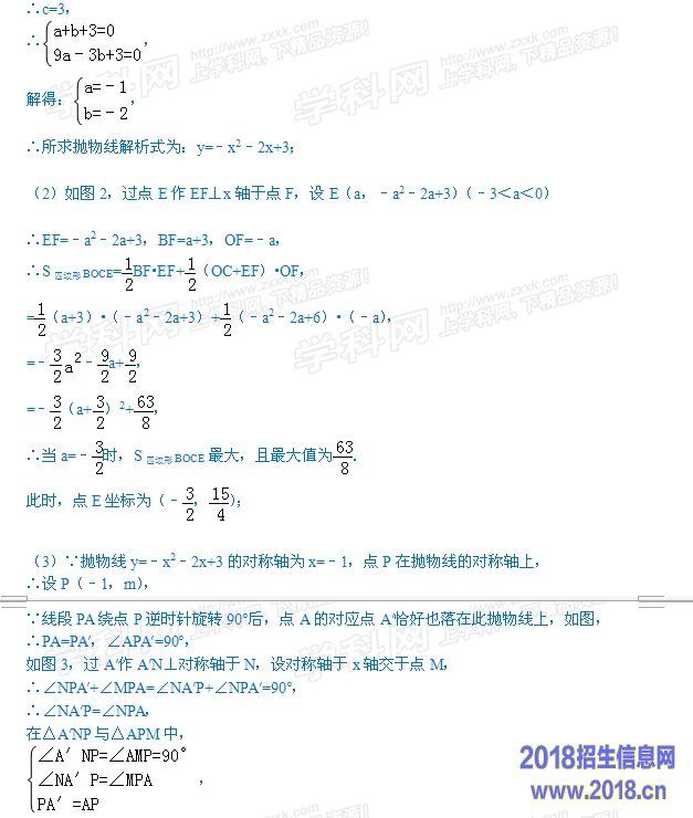 (3)由P在抛物线的对称轴上,设出P坐标为(﹣2,m),如图所示,过A′作A′N⊥对称轴于N,由旋转的性质得到一对边相等,再由同角的余角相等得到一对角相等,根据一对直角相等,利用AAS得到△A′NP≌△PMA,由全等三角形的对应边相等得到A′N=PM=|m|,PN=AM=2,表示出A′坐标,将A′坐标代入抛物线解析式中求出相应m的值,即可确定出P的坐标.