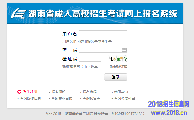 湖南省2015年成人高校考试招生考试时间已经确定,考试时间为10月24日、25日两天,报名时间为9月6日至9月16日。其中,9月6日至9月10日为户籍所在地考生网上报名、缴费及现场确认,9月11日至9月16日为所有考生网上报名、缴费及现场确认。成人高考报名网址为https://chengzhao.hneao.cn/ks。