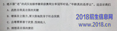 2.【解析】选A。本题考查的知识点是自强?根据题干中李娜的说法可以判断她真正战胜了自我,获得了冠军,所以A是正确的;B投身社会实践的说法与题干不符;C说的是悦纳他人分,而题干中是战胜了自己;D自强的航标是理想,捷径是战胜自我。