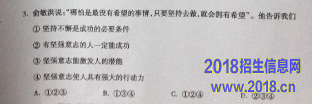 【解析】选B。本题考查的知识点是坚强意志。据题干中俞敏洪的话可以得出坚强意志的作用,①坚持不懈符合题干的要求;②说法过于绝对化,有坚强意志的人不一定能够成功;③激发