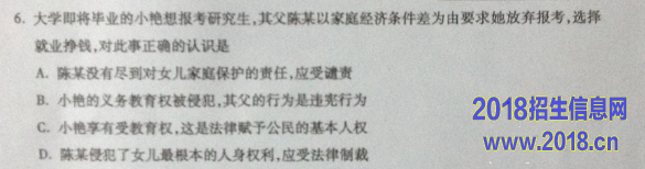 6.【解析】选C。本题考查的知识点是受教育权。题干给出的信息是小艳大学毕业想报考研究生,她的爸爸陈某拒绝她的报考要求。选项A提到的家庭保护与题干中的受教育权无关;选项B提到的义务教育权说法与题干也不符,因为在我国保障的是九年义务教育,研究生不属于义务教育阶