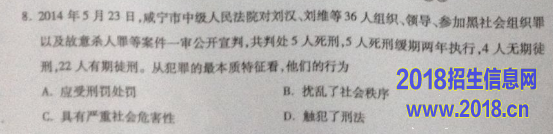 【解析】选C。本题考查的知识点是犯罪的最本质特征。题干中给出的行为是严重违法行为,最本质的特征是社会危害性的大小,社会危害性大的犯罪行为。A是犯罪的特征;选项B是行为造成的影响;D所有触犯刑法的行为都是犯罪行为。[来源:学|科|网Z|X|X|K]