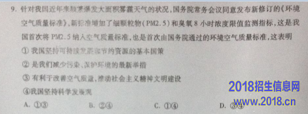 9.【解析】选B。本题考查的知识点是保护环境的措施。把PM2.5纳入空气质量标准体现了保护环境的做法,②是正确的;④科学发展观是以人为本,全面、协调、可持续发展的发展观;①提到的保护环境与题干不符;③提到的是精神文明,题干中提到的是生态文明,