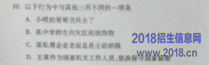 10.【解析】选B。本题考查的知识点是区分权利和义务。A小明履行的是依法服兵役的义务;C私营企业老板履行的是依法纳税的义务;选项D王某履行的是保守国家秘密的义务;选项B某中学师生向灾区捐款捐物属于献爱心,所以ACD都是公民的义务,是必须履行的,B不具有强制性。