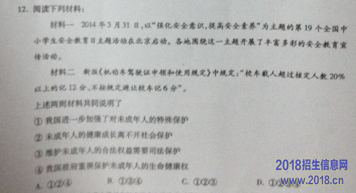 【解析】选A。本题考查的知识点是未成年人保护。材料一各地开展丰富多彩是安全教育宣传活动体现了特殊保护和社会保护,①②符合题意;③司法保护是司法机关提供的保护,材料中没有体现;材料二中的规定避让校车体现了对未成年人生命健康权的保护,④正确。