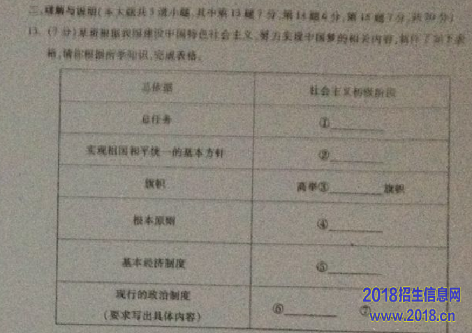 13.【解析】本题是一道图表题,要求结合建设中国特色社会主义和实现中国梦的相关知识,谈谈社会主义初级阶段的总任务、实现祖国和平统一的基本方针、旗帜、根本原则、基本经济制度、宪政政治制度等相关内容,回答时结合所学知识直接作答即可。