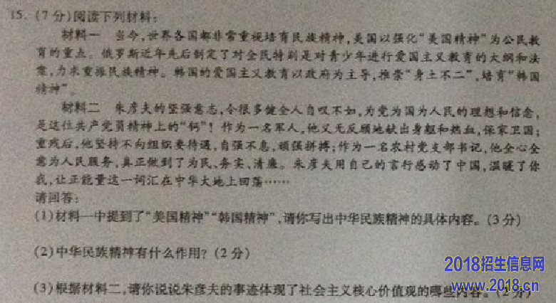 【解析】本题通过两则材料考查学生对于民族精神相关知识的认识和掌握。第(1)(2)问问为基础考查,结合所学直接答出民族精神的内涵和作用即可;第(3)问需要结合材料二中朱彦夫的行为进行分析。作为军人他义无反顾地保家卫国体现出他爱国,作为一名农村党支部书记,他全心全意为人民服务,体现出他敬业。