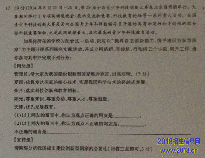 1【解析】本题考查的知识点是科技创新。第(1)问通过管理员提出的建设创新型国家的做法,网友们纷纷发表自己的观点,首先找出观点正确的炫月、阳光;第(2)问考查错误的是夏雨,回答理由时围绕着内因是事情发展的决定性因素;宣传组回答的必要性是为什么;行动组回答的努力方向需要答出怎样做。