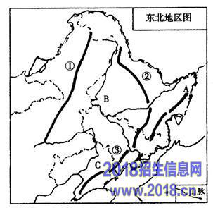 A.①是大兴安岭B.②是长白山地C.B是辽河平原D.C是三江平原