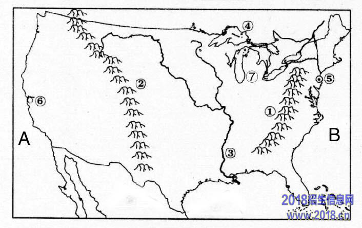(1) B 洋。落基山脉是数