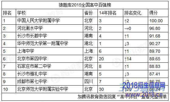 腾讯教育讯 9月8日,猿题库评价研究中心正式公布《猿题库2015中国高中排行榜》,中国人民大学附属中学以较大优势位居全国第一,河北衡水中学和长沙长郡中学排名第二和第三,而2014年排名第一的华中师范大学第一附属中学今年则降至第四。