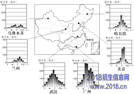 20.阅读我国部分城市分布及其降水量柱状图(如图),回答下列问题: