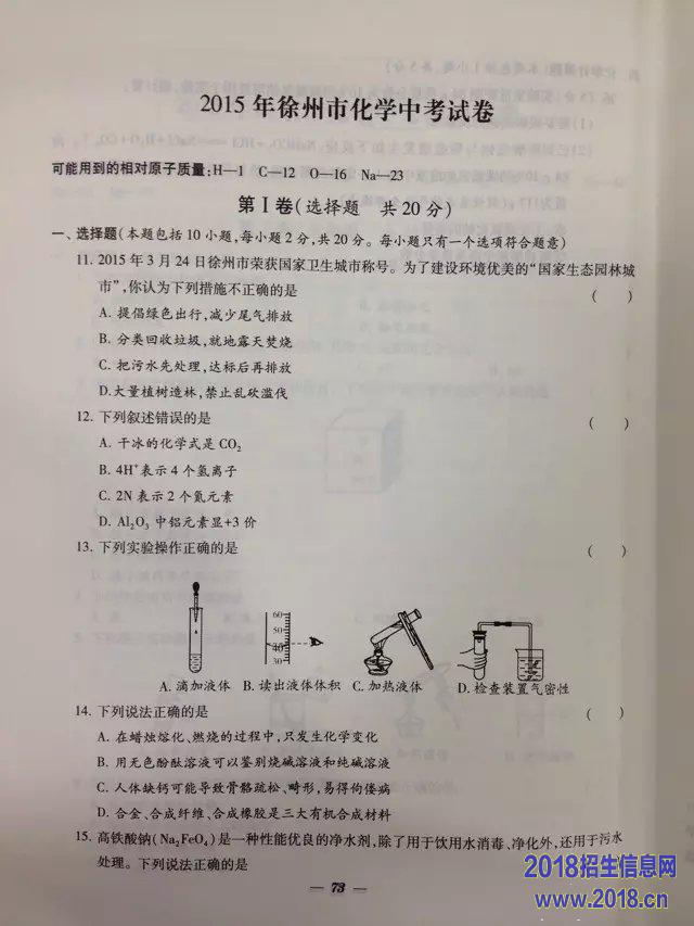 2015年江苏省徐州市中考化学试题(扫描版,含答案)