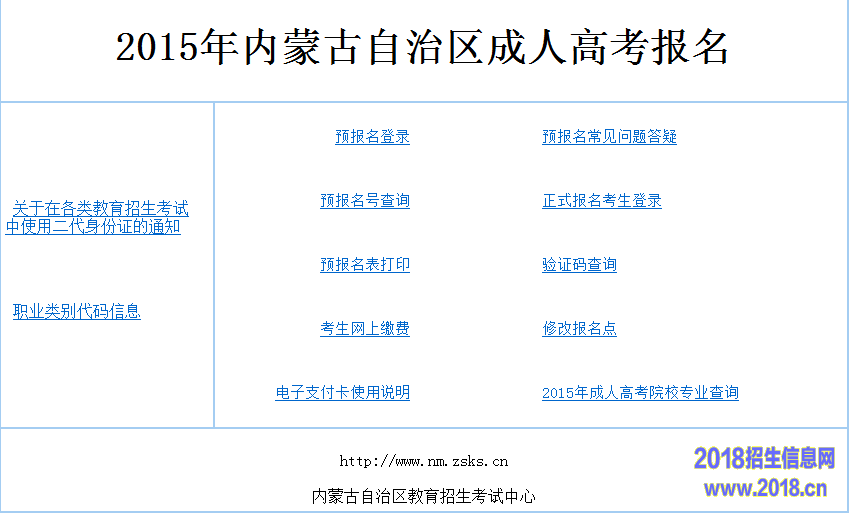 2015年内蒙古成人高考报名入口已开通,考生可在9月14日-9月24日登陆内蒙古招生考试信息网或点击下面链接进行网上报名。