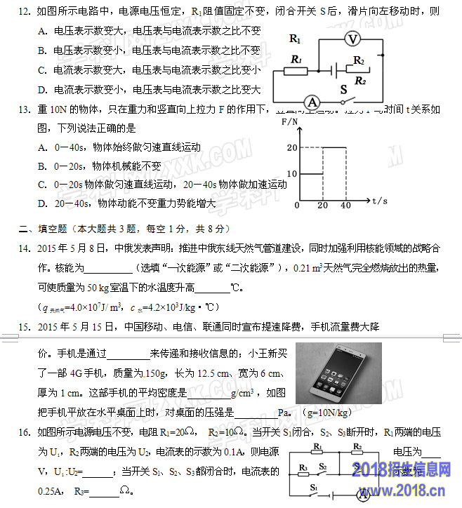 2015年内蒙古鄂尔多斯市初中毕业升学考试物理试题(含答案)