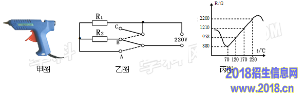 23.如图甲所示的热熔胶枪是一种装修工具,用于材料涂胶。它的内部有两只相同的PTC(正温度系数)加热元件。其工作电路如图乙所示。扣动扳机能使固体胶条向前挤压,联动开关同时掷向A、B,枪口冒出胶液;松动扳机,联动开关同时掷向B、C。单只PTC元件的电阻随温度的变化图像如图丙所示。求:
