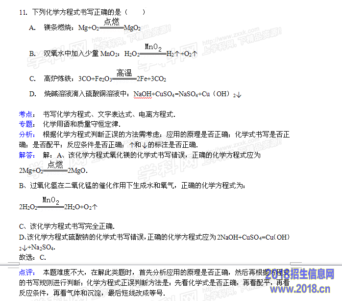 分析: 首先根据反应原理找出反应物、生成物、反应条件,根据化学方程式的书写方法、步骤(写、配、注、等)进行书写;再根据反应特征确定反应类型.