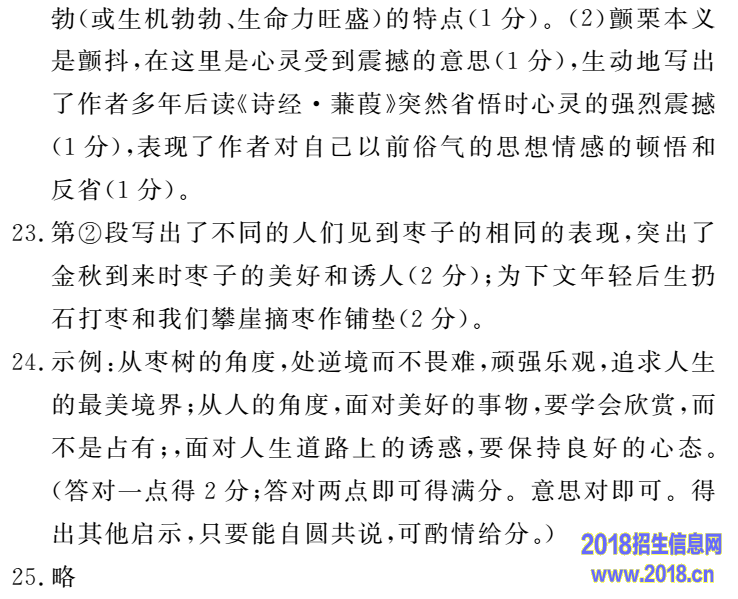 23.(1)第②段写出了不同的人们见到枣子的相同的表现,突出了金秋到来时枣子的美好和诱人(2分);为下文年轻后生扔石打枣和我们攀崖摘枣作铺垫(2分)(4分。意思对即可。)