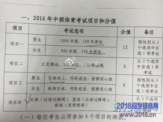 市教育局发布了2016年厦门市中招体育考试方案,2016年厦门市体育中考将由原来的25分增加到30分,其中新增100米游泳、100米跑、足球、篮球、排球等选考项目。考试分为四个项目,考生必须从选项中按性别自选。明后年,厦门还将继续对体育中考进行调整,初步计划2017年分值增加到35分。