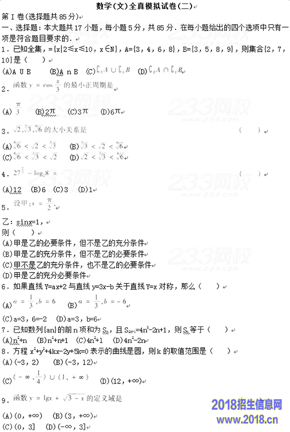 2015年成人高考高起点数学(文)模拟试题及答案(2)