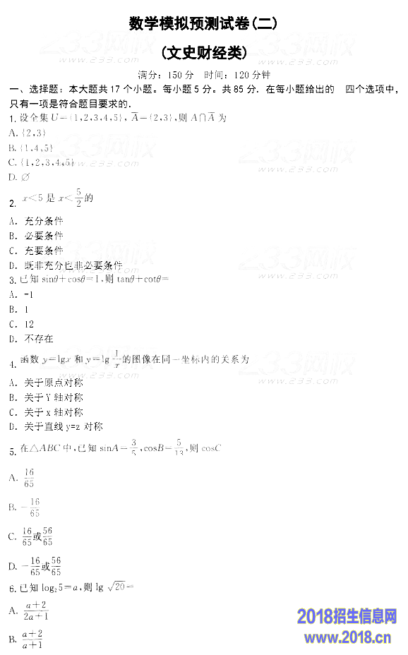 2015年成人高考高起点数学(文)模拟试题及答案(4)