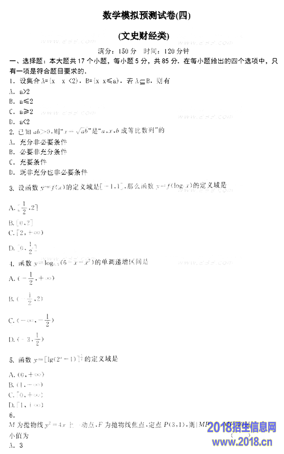 2015年成人高考高起点数学(文)模拟试题及答案(6)