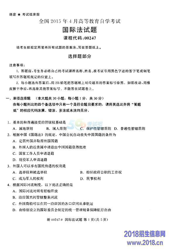 全国2015年4月自学考试《国际法》真题