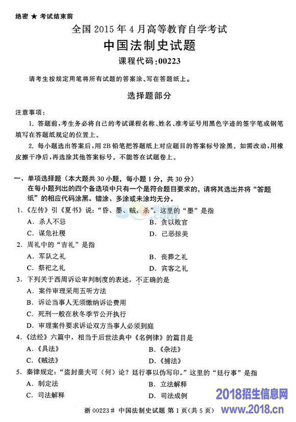 全国2015年4月自学考试《中国法制史》真题