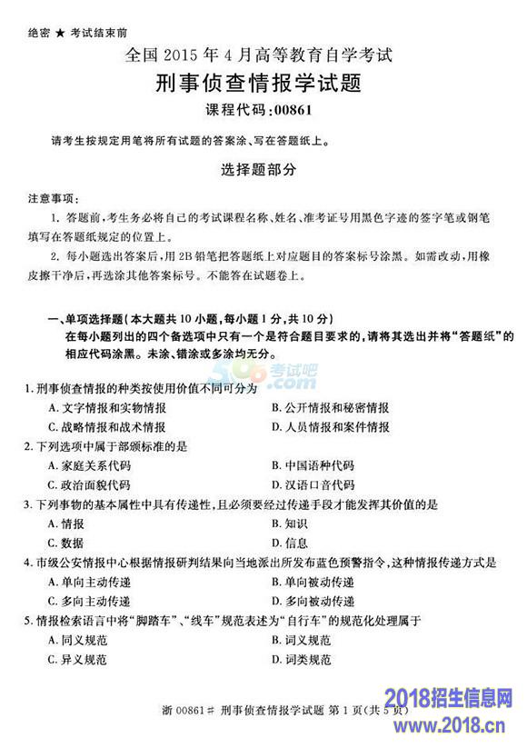 全国2015年4月自学考试《刑事侦查情报学》真题
