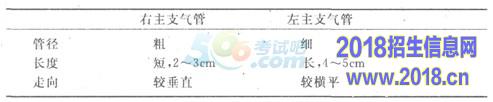 左、右主支气管自气管分出后,各自向外下方走行,经肺门入肺,再分出肺叶支气管。右主支气管粗而短,长2~3cm,走行方向较垂直;左主支气管细而长,为4~5cm,走行方向较横平,故误入气管的异物多坠入右主支气管。