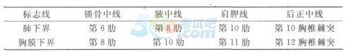 两肺下缘均沿第6肋软骨下缘斜向外下方,在锁骨中线处与第6肋相交,在腋中线与第8肋相交,在肩胛线与第10肋相交,近后正中线处,达第10胸椎棘突的高度。