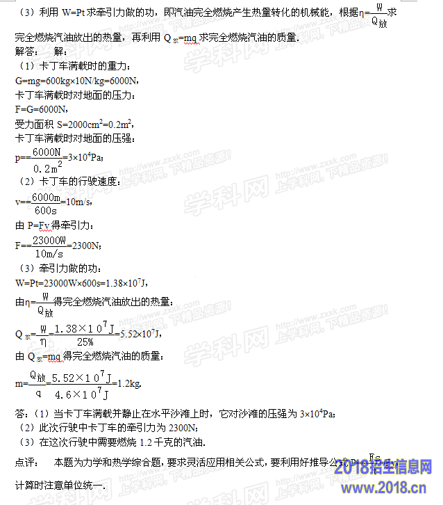 分析: (1)知道卡丁车满载时的质量,利用G=mg求其重力,卡丁车满载时对地面的压力等于其重力,知道受力面积,利用p=求卡丁车满载时对地面的压强;