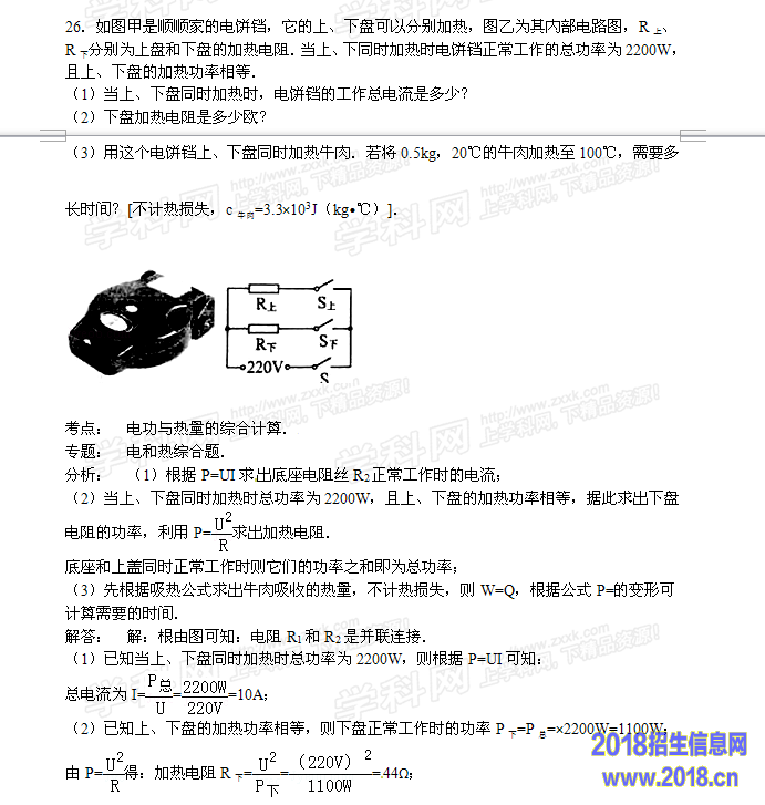 分析: (1)电能表上参数的意义:①220V说明电能表要在220V的电路中使用;②10A表示电能表允许通过的最大电流是10A;20A表示电能表在短时间内允许通过的最大电流是20A,根据电能表上的参数可以根据公式P=UI计算出电能表允许接的最大电功率.