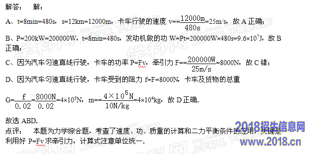 11.一辆载有货物的卡车在平直的高速公路上匀速行驶时发动机的功率为200kW,行驶12km所用的时间是8min,所受阻力是卡车及货物总重的0.02倍.则在这段时间内( )g=10N/kg.
