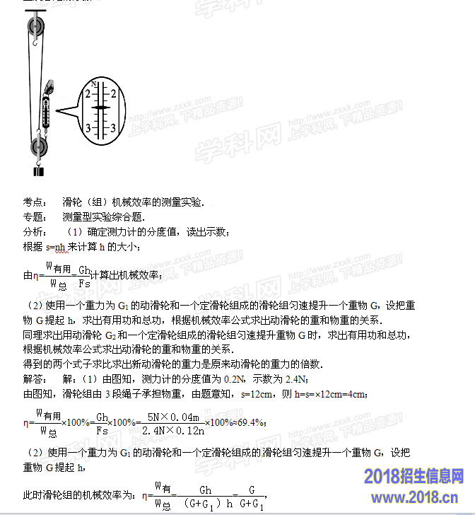 (1)用弹簧测力计竖直向上缓慢拉动重为5N的钩码,由图示可知拉力大小为 2.4 N,将弹簧测力计向上移动12cm,则钩码上升的高度为 4 cm,该滑轮组的机械效率是 69.4% (结果保留到0.1%).