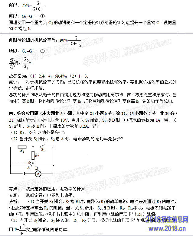 (2)提高机械效率的主要办法是改进结构,使它更轻巧.若如图装置中动滑轮的重为G1,用它提升一重物,滑轮组的机械效率为75%;改用一个轻质材料制作的重为G2的动滑轮后,再提升同一重物,滑轮组的机械效率提高到了90%,则G2与G1之比为 1:3 (不计绳重及各处的摩擦).