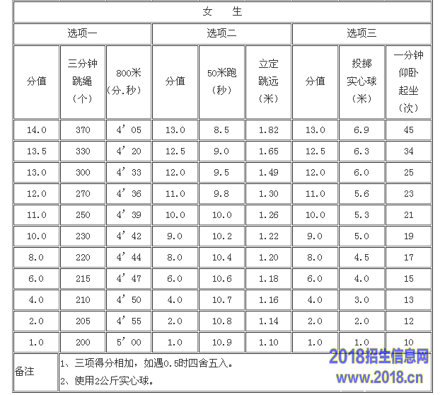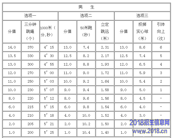 体育考试采取选项办法,考生在三类选项中各选择一个项目测试,三项满分为40分,计入升学总分。