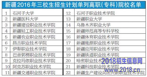 在报名启动的同时,新疆“三校生”2016年招生计划单列高职(专科)院校的名单也随之公布,共有石河子大学、乌鲁木齐职业大学等22所院校进行招生。