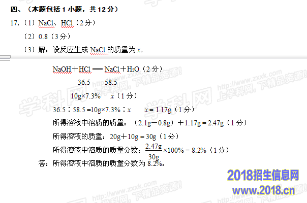 17.(12分)取NaOH和NaCl的混合物2.1g放入烧杯中,加水溶解配制成20g的溶液,逐滴滴入溶质质量分数为7.3%的稀盐酸,溶液的pH与滴入稀盐酸质量的关系如下图所示。