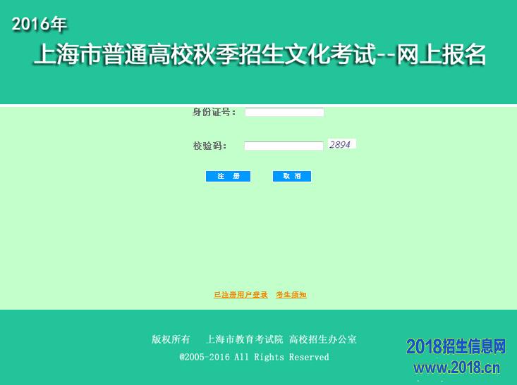2016年上海市普通高等学校秋季招生考试报名工作将于2015年11月18日至11月20日上午进行。凡符合上海市教委规定的2016年普通高校招生考试报考资格的考生,从2015年11月18日10:00起至20日10:00止(值班时间每天9:30至16:00),在“上海招考热线”网站(www.shmeea.edu.cn/www.shmeea.com.cn)进行网上报名。以下是2016年上海高考报名入口。