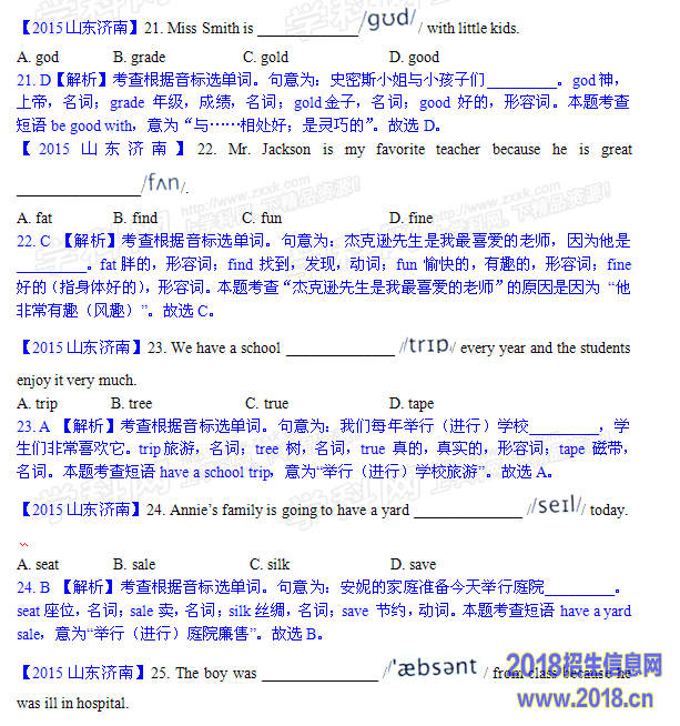 25. D 【解析】考查根据音标选单词。句意为:这男孩_________上课,因为他生病住院了。about关于,大约,介词;artist 画家,名词;accept 动词, 接受;absent 缺席的,形容词。本题考查短语be absent from class,意为“缺席上课”。故选D。