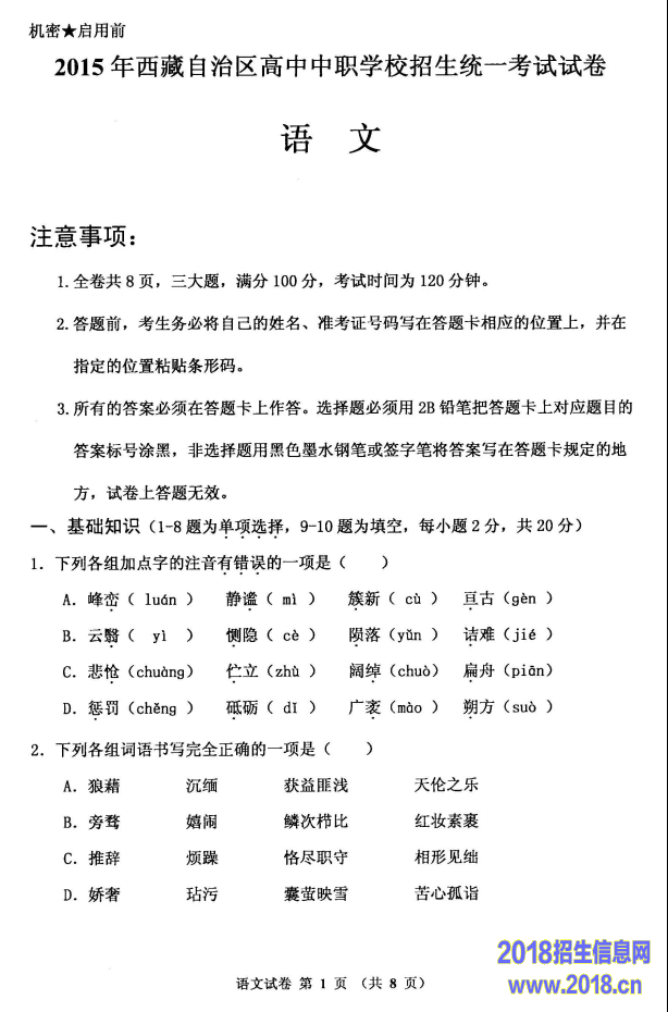 2015年西藏自治区中考语文试题(扫描版,含答案)