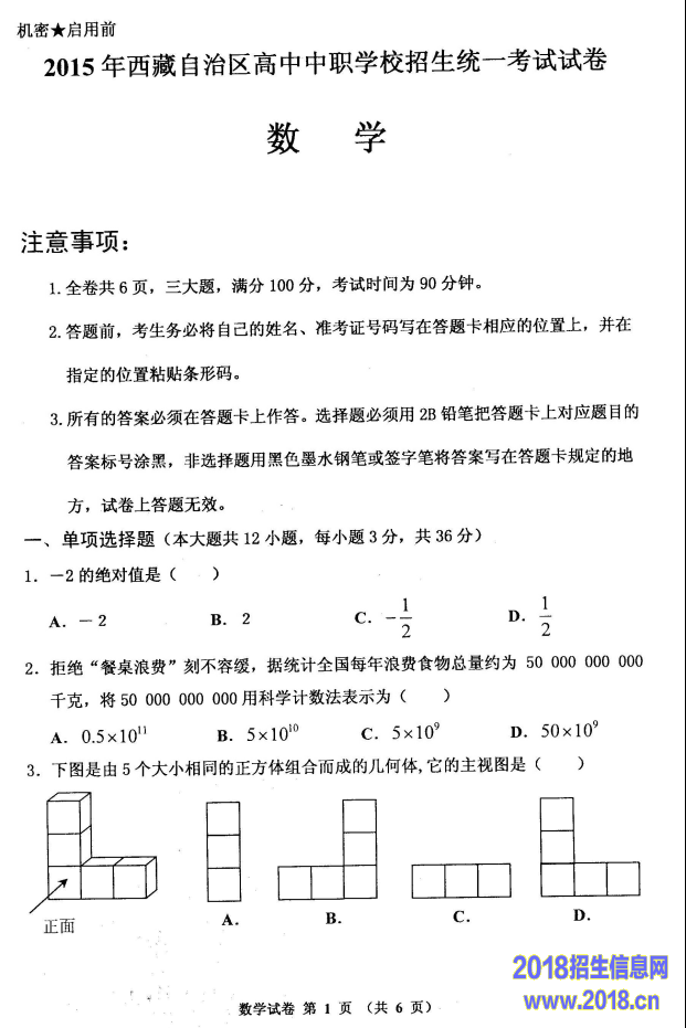 2015年西藏自治区中考数学试题(扫描版,含答案)