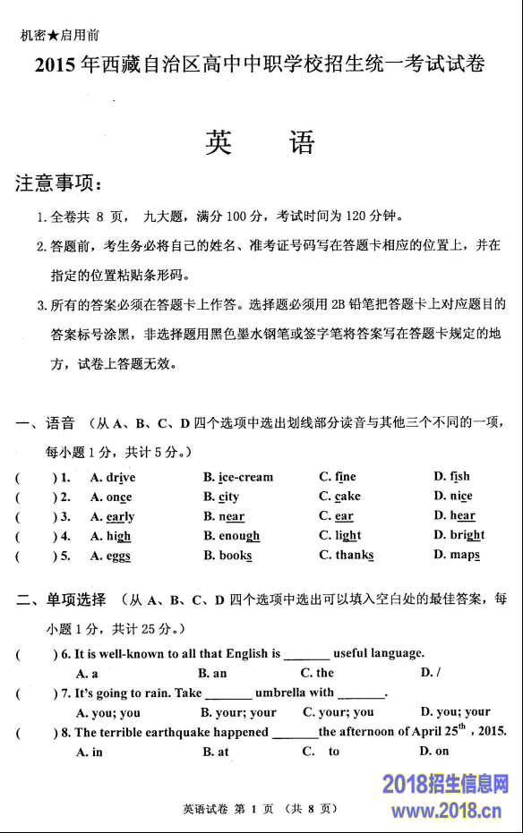 2015年西藏自治区中考英语试题(扫描版,含答案)