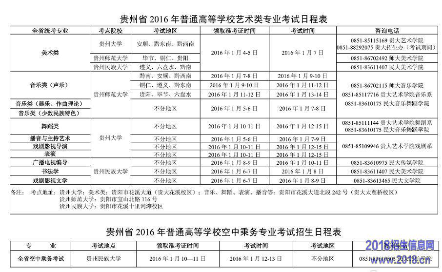 贵州省2016年普通高等学校艺术类专业考试日程表