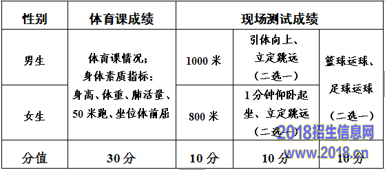 体育测试成绩评定是学生体育课成绩和现场测试成绩之和。体育课成绩是学生体育课情况和身体素质测试成绩,总分30分,其中身体素质测试内容有身高、体重、肺活量、50米跑、坐位体前屈等内容;现场测试成绩是依据《国家学生体质健康标准(2014年修订)》评定,总分30分。现场测试成绩按照“四舍五入”的原则处理,测试结束后,与学校体育课成绩相加,作为学生体育测试的最终成绩。测试项目与分值见下表。