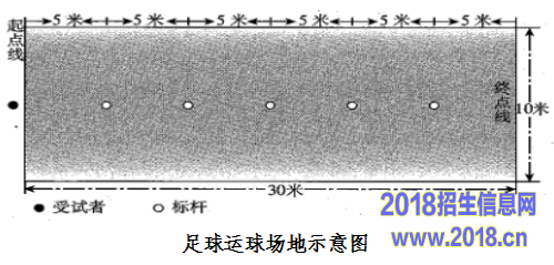 在坚实、平整场地或足球场上进行,测试区域长30米,宽10米,起点线至第一杆距离为5米,各杆间距5米,共设5根标志杆,标杆距两侧边线各5米。测试用足球符合国家标准,标志杆杆高1.2米以上。如下图。