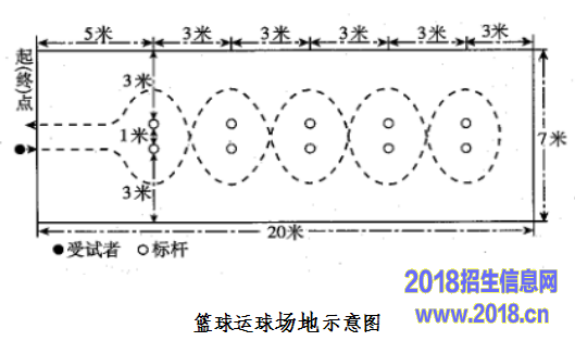 测试场地长20米,宽7米,起点线后5米设置两列标志杆,标志杆距左右边线3米。各标志杆距杆3米,共5排杆,全长20米,并列的两杆间隔1米。测试用篮球符合国家标准,测试标志杆杆高1.2米以上。如下图。