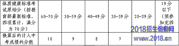 其中,体质健康标准考试项目为身高体重、肺活量、坐位体前屈、50米,考试标准按10分、9分、8分、7分、6分、4分六档记分(体质健康标准考试原始分与分档成绩换算办法见下表)。